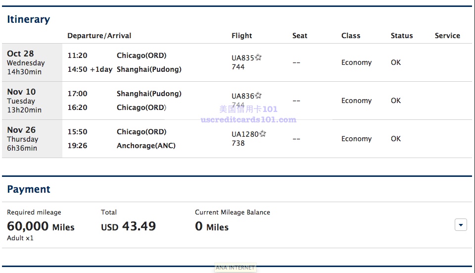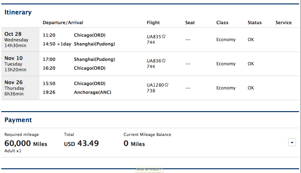 但是最远貌似就到这里了,墨西哥也可以,但是不能到夏威夷,因为上海到夏威夷所需的往返里程是 55,000,上海到芝加哥的往返里程是 60,000. ANA 规定转机不能到“高区位”的城市转,所以上海到夏威夷不能从所需里程更高的芝加哥转。
