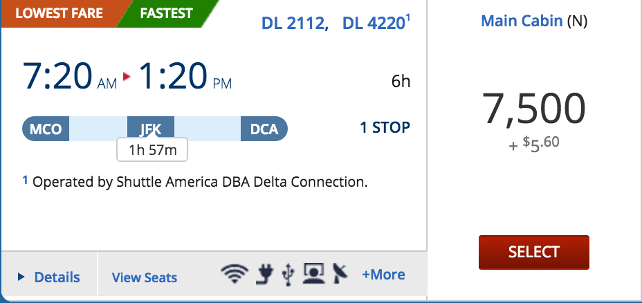 如果你能去加拿大的话,那么就更方便了,毕竟美国-加拿大单程只要 9500 达美里程。举个例子,如果你想从 Orlando, FL 飞到 Seattle 的话,由于美东-YYJ 单程是 8500 里程,所以是可以把终点设到 YYJ,舍弃掉第二段,就可以用 8500 达美里程飞个跨美国本土对角线的单程: